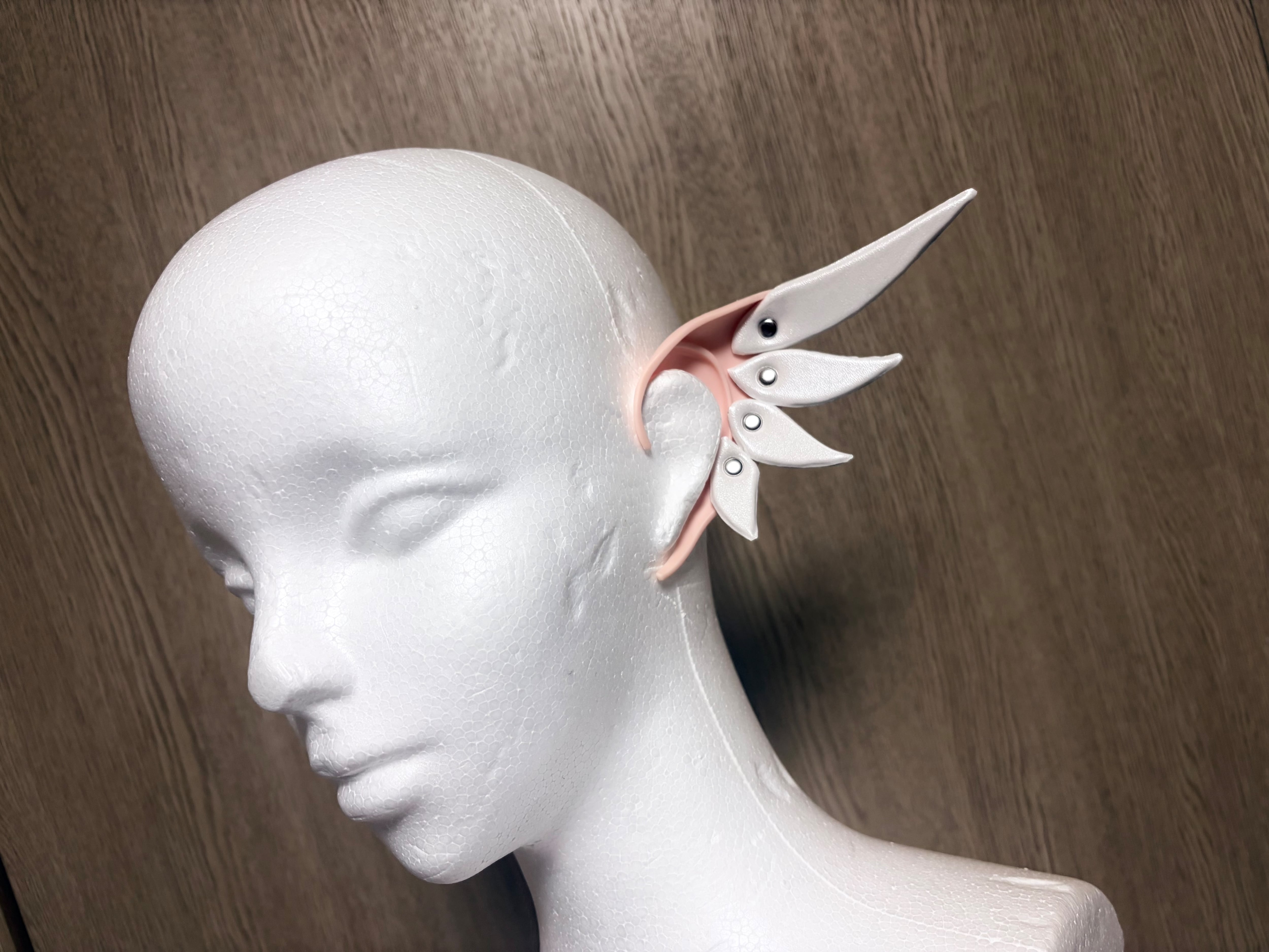 シリコン製のイヤーフックタイプのつけ耳に羽根を生やしています。